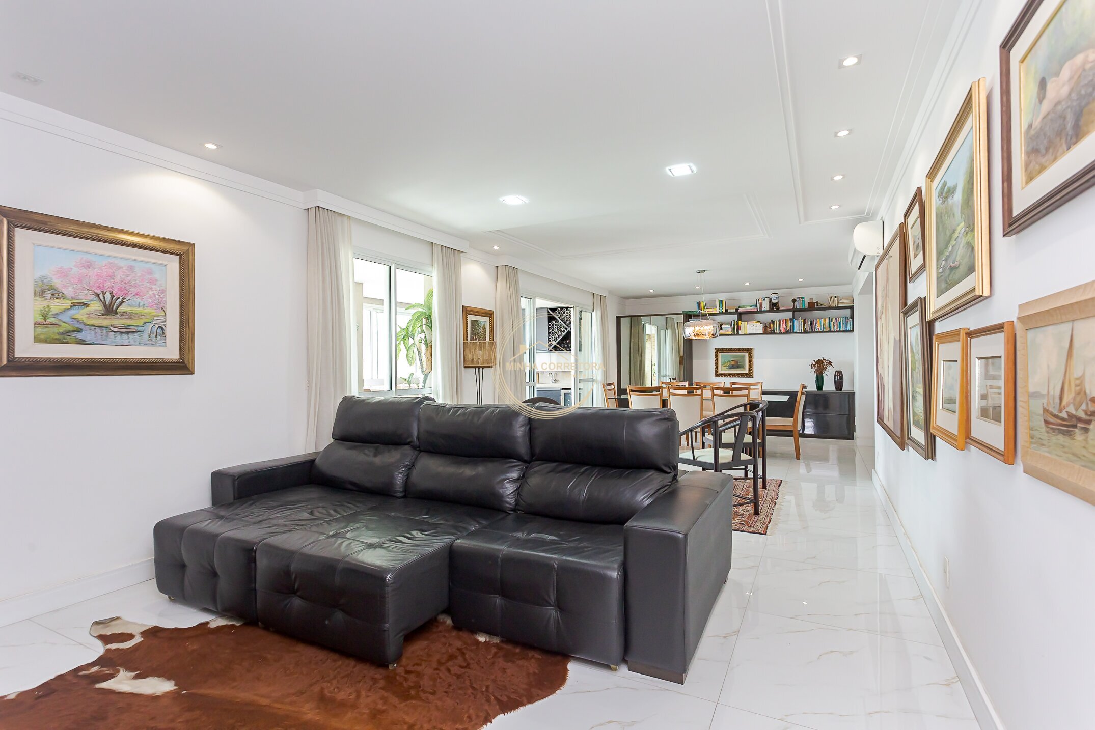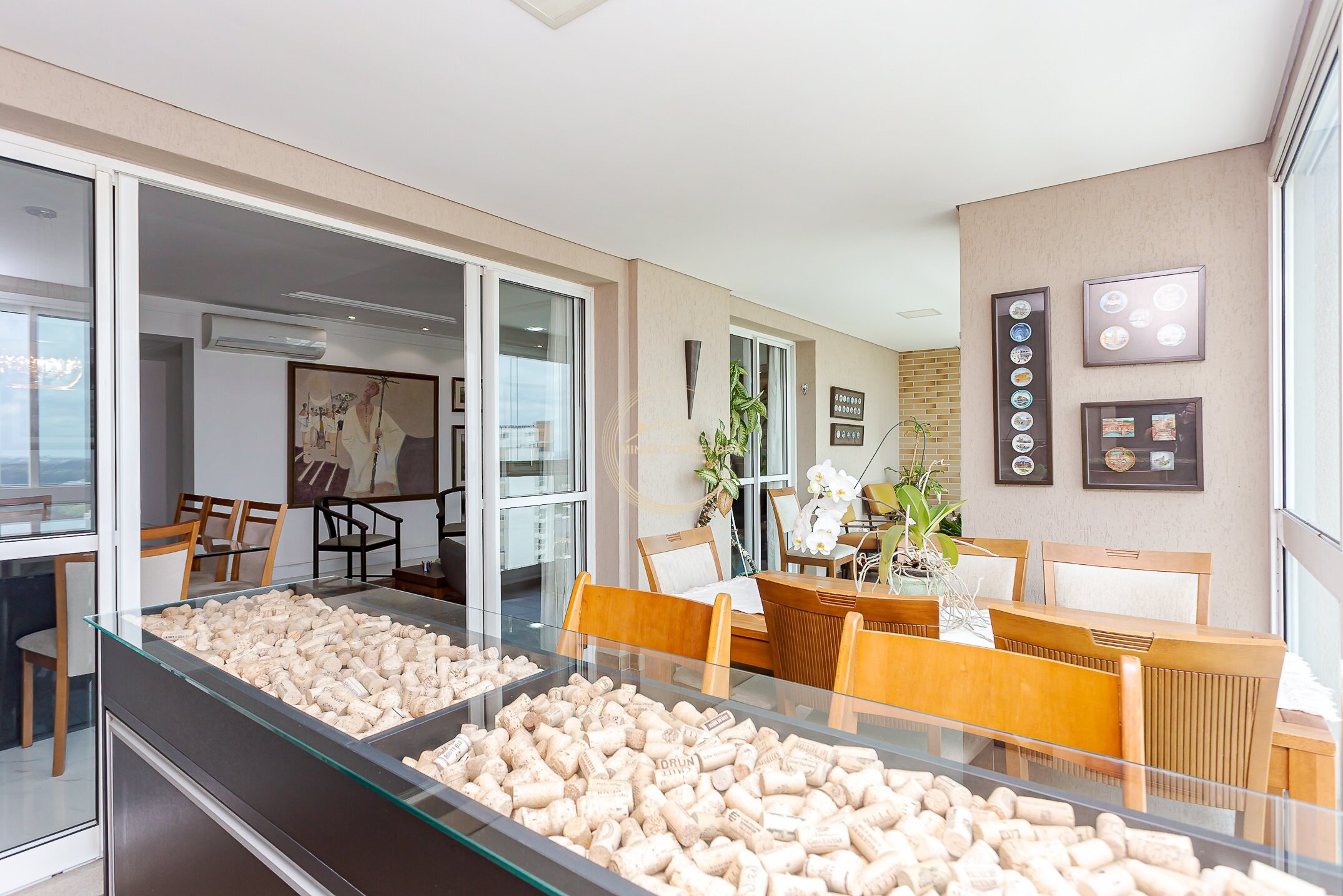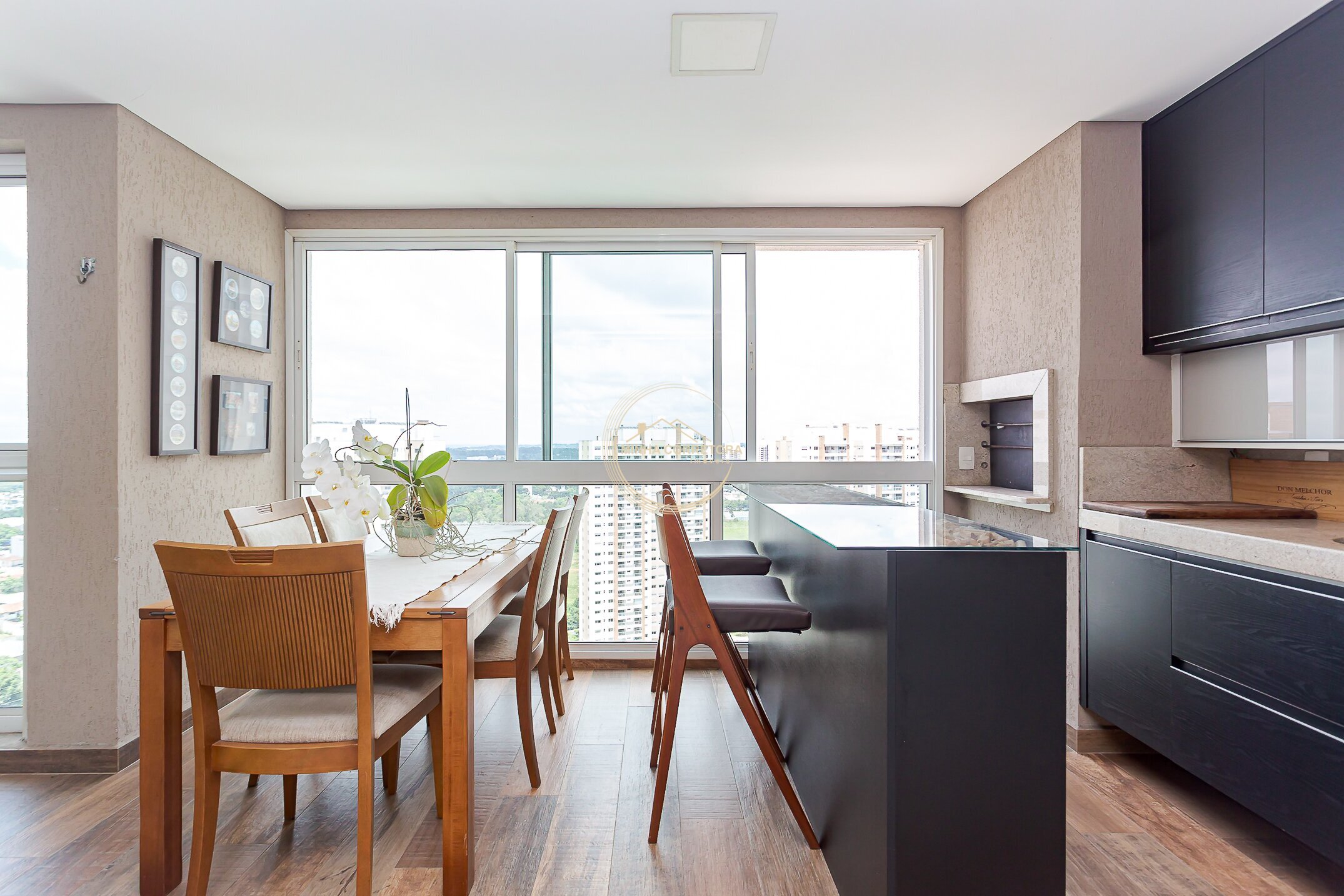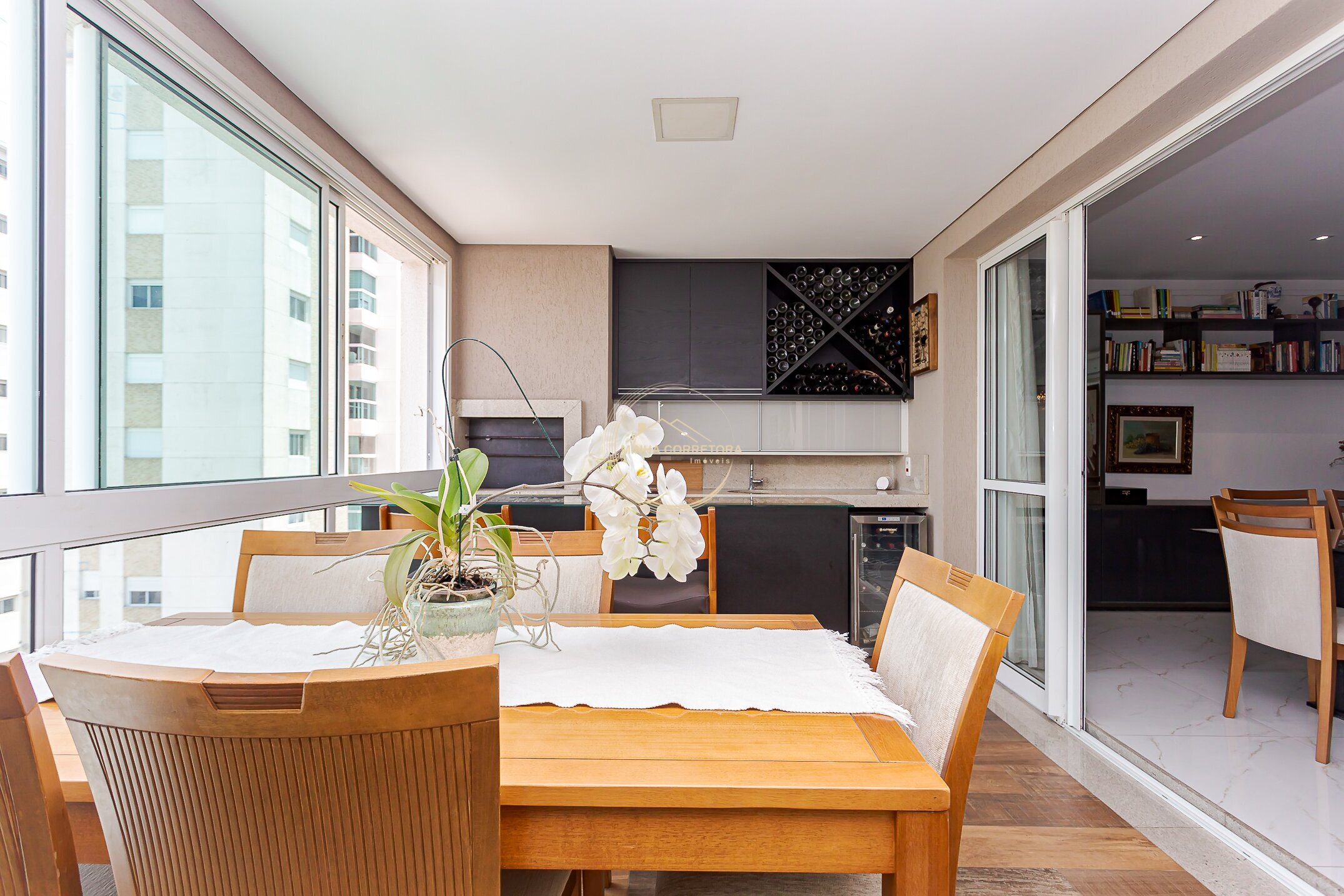 A ampla sala se integra à varanda gourmet com churrasqueira a carvão — o espaço perfeito para relaxar ou reunir quem você ama.