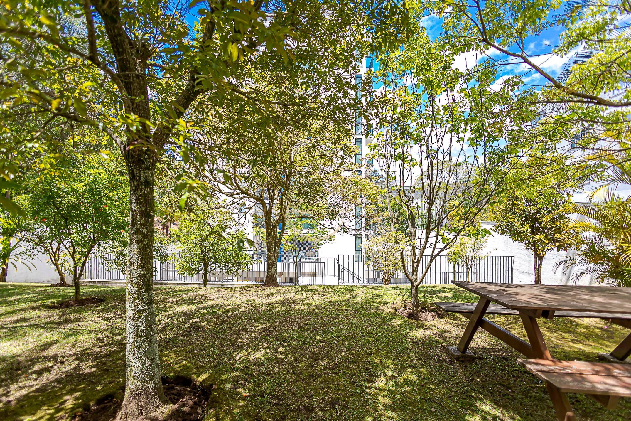 Jardim com área de convivência;